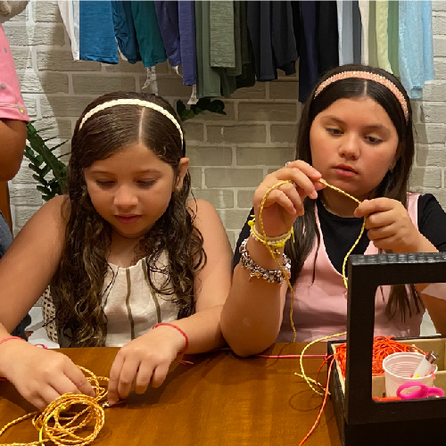 Durante o evento, as crianças puderam participar de uma oficina de criação, onde aprenderam a fazer suas próprias pulseiras. A atividade estimulou a imaginação, a troca entre amigas e reforçou a criatividade que faz parte do nosso universo. Foi um momento especial de aprendizado e diversão, que tornou o dia ainda mais inesquecível.